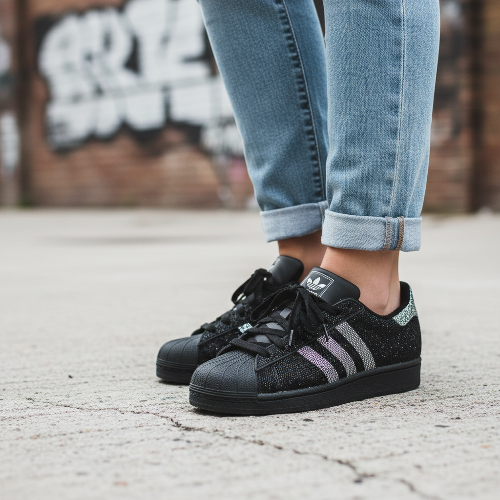 The Adidas Glitter Superstar Sneaker reimagines a legendary classic with a playful, eye-catching twist. Built on the instantly recognizable Superstar silhouette, this pair blends timeless street style with shimmering details that stand out effortlessly.
